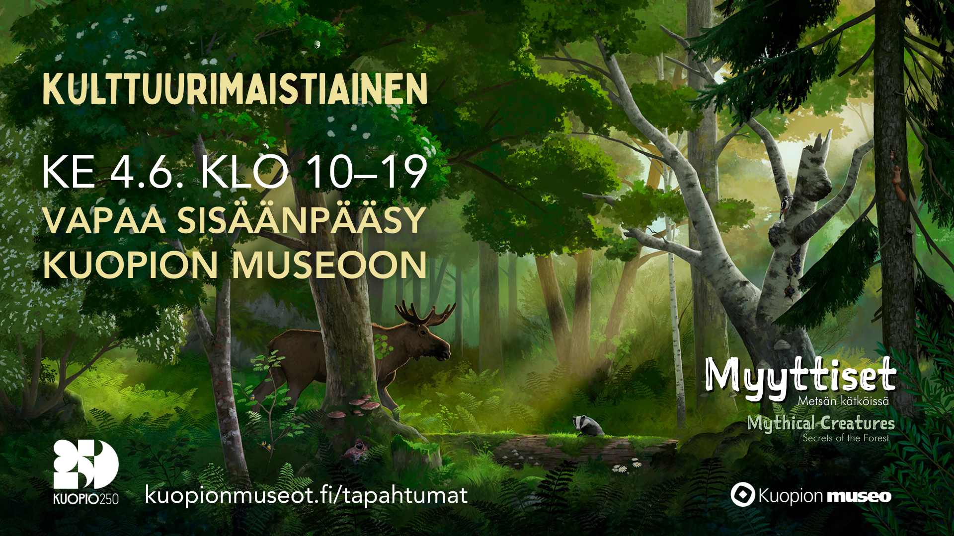 Lapsille suunnattu Myyttiset-näyttelyopastus kuljettaa oppaan johdolla pienet kulkijat halki entisaikojen metsän. Opastus sisältyy museon pääsymaksuun.