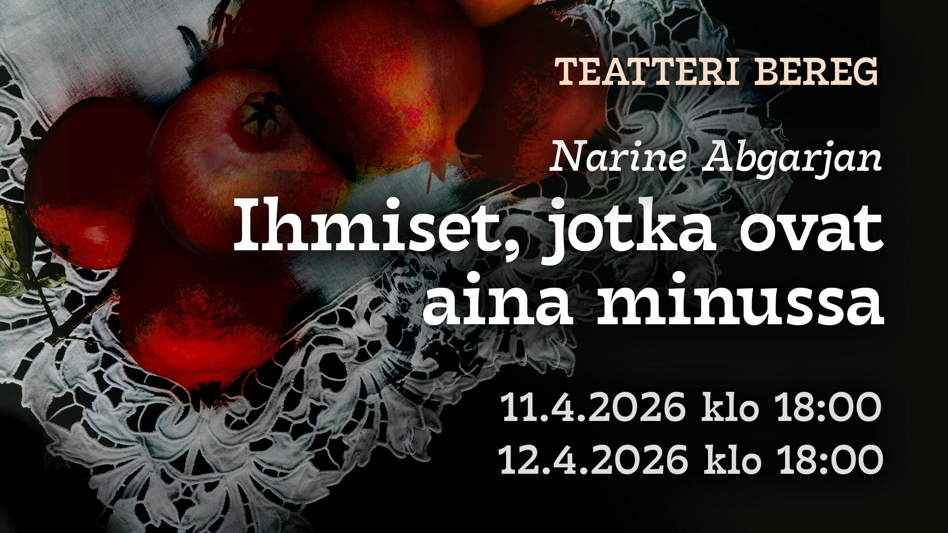 Kulttuuriareena 44 Kauppakatu 44, Kuopioeatteri Bereg esittää Ihmiset, jotka ovat aina minussa näytelmän, joka perustuu Narine Abranjanin samannimiseen romaaniin. Näytelmä esitetään suomenkielisillä tekstityksellä.